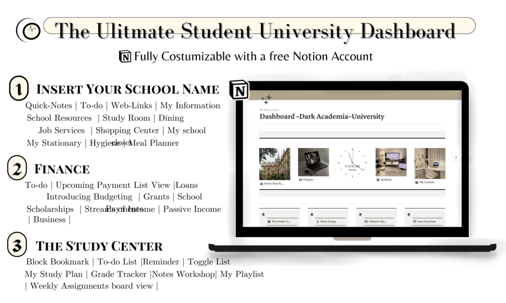 Light Academia University Notion Planner Template for College Students | ADHD Friendly | Writer | Movie | School | Fashion | Finance | Gift
