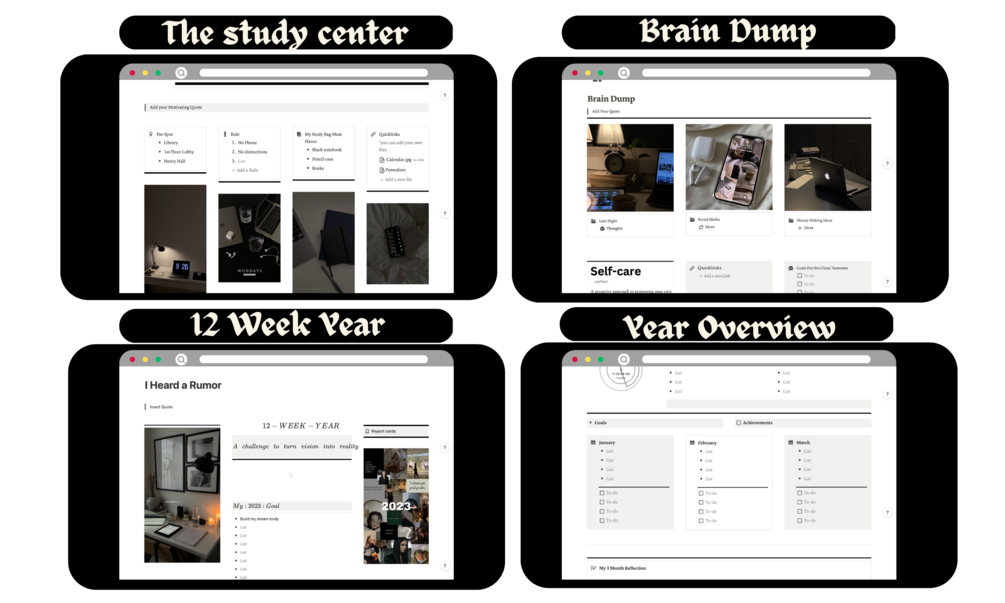 The Ultimate Dark University Academia Notion Planner Template for College Students aiming to help you unleash your potential and transform your life to the fullest... One Click at Time, I know How hard College can be especially when starting so I created this template to help you navigate Notion with ease and get the best of the college experience | ADHD friendly | Writer | Employment | Movie Collection | Fashion | closet | Wishlist | School | Documents | My courses| Finance| Vision Board| Life Planners| Create a Morning, Evening, Night Routine and more are included in this planner. Hope you Enjoy! Feel free to ask Questions.